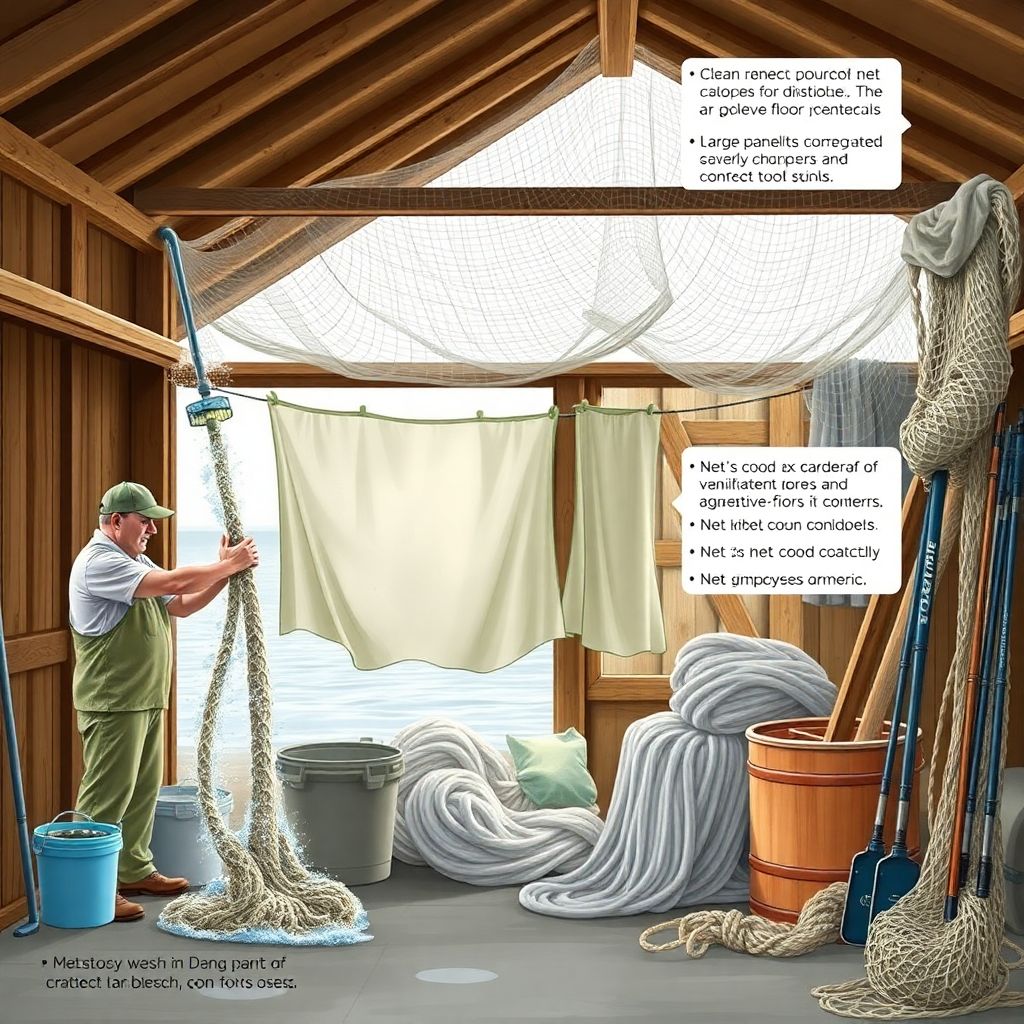 Хранение — это не просто “повесить на гвоздь”. В идеале требуется отдельное сухое помещение или хотя бы хорошо проветриваемая кладовая. Влажность воздуха должна быть умеренной, без конденсата на стенах и металле. Сети и снасти не должны контактировать с острыми предметами, маслом, горюче‑смазочными материалами и грызунами.
